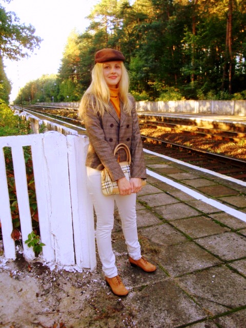 Trochę kratki, trochę kolorów ziemi i żakiet, to niektóre elementy odzwierciedlające angielski styl. Do tego kaszkiet choć to męski dodatek ale też pasuje. W końcu moda to zabawa 🙂